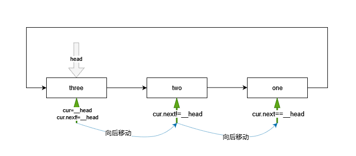 # 此时cur位于最后一个节点,他的next指向__head,但是在while循环中并未打印